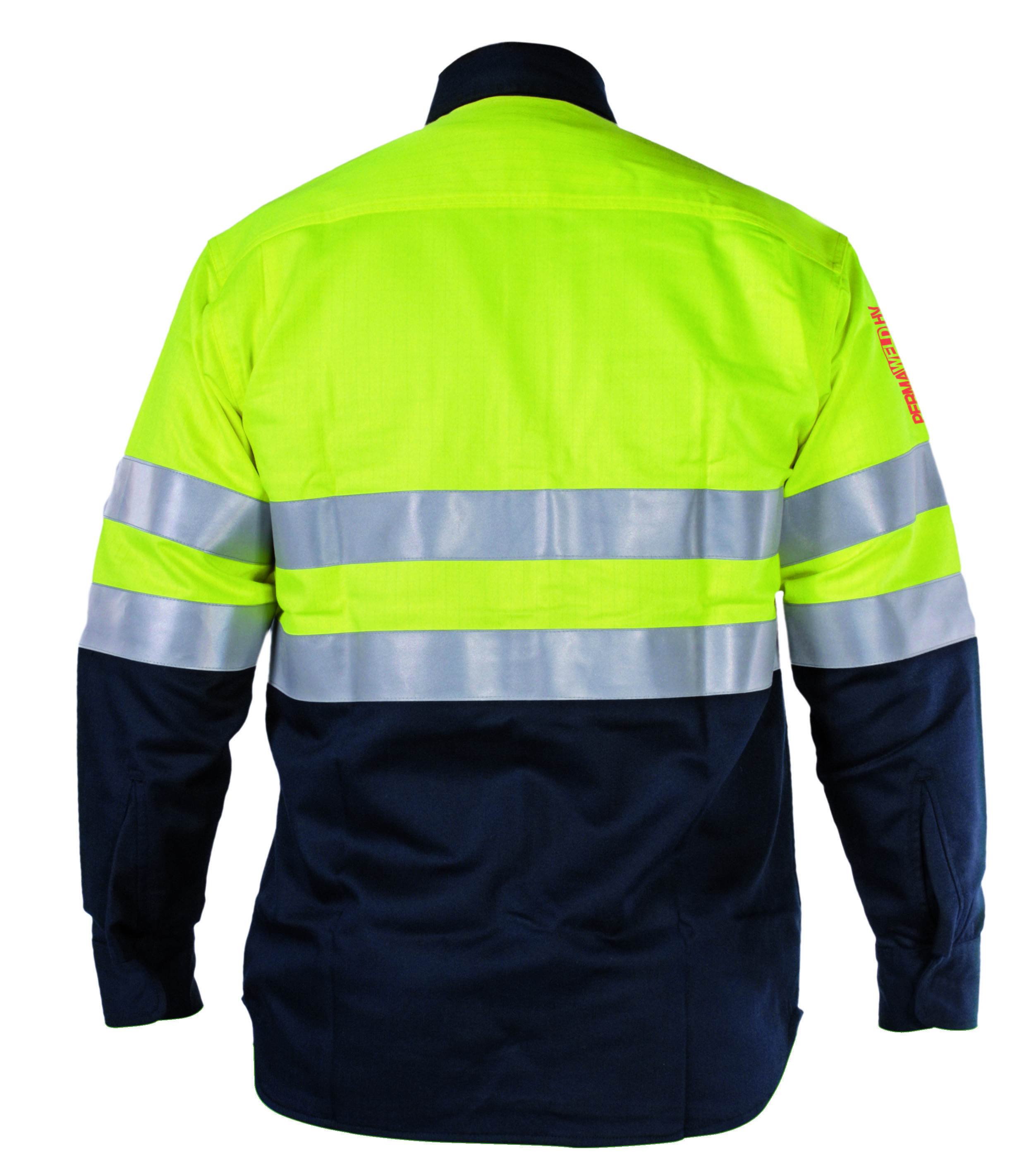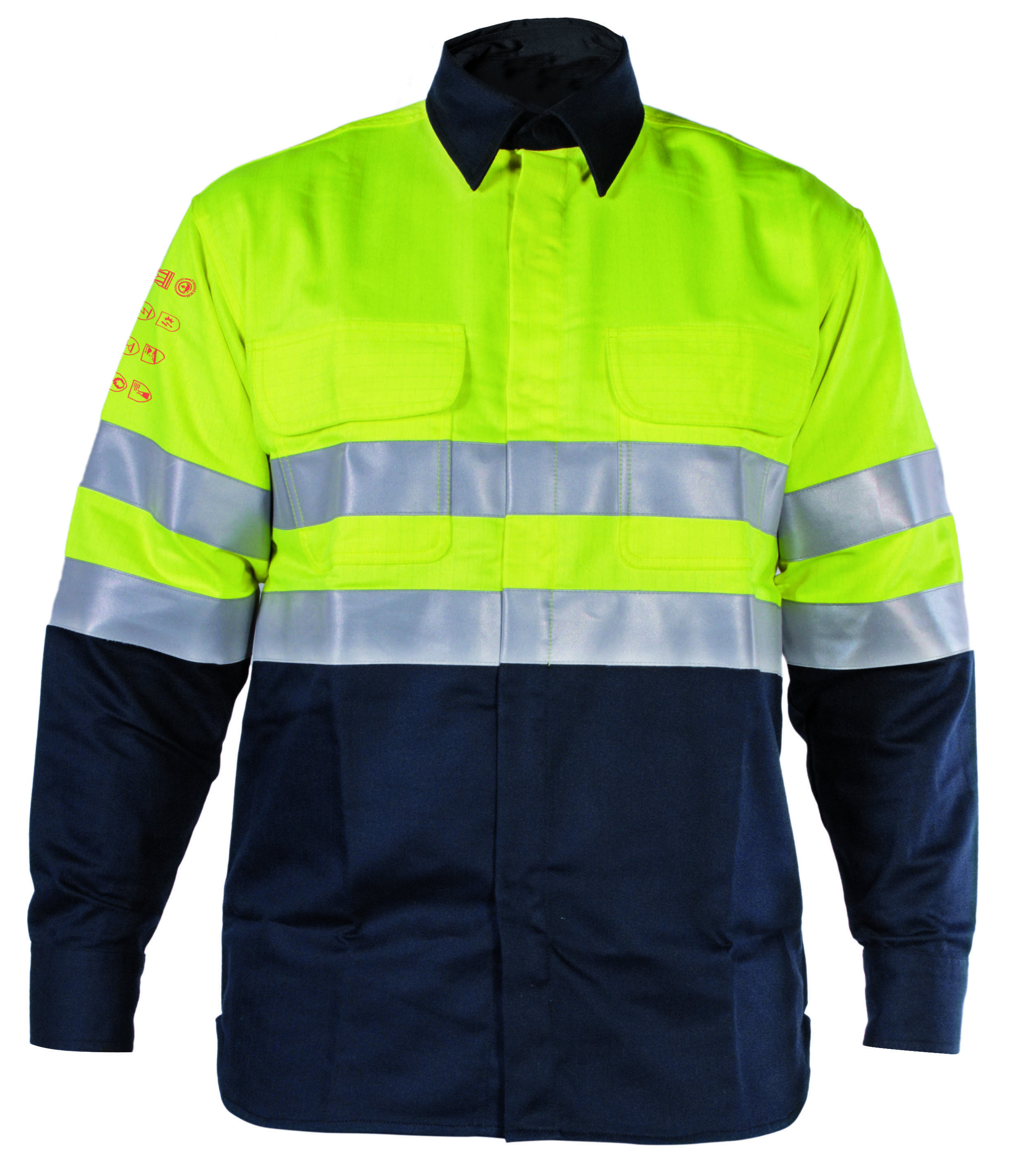 Camisa de gran confort y diseño para soldadura o afines fabricado en 49% Modacrílico, 42% Algodón, 5% para-aramida, 3% poliamida y 1% fibra antiestática para uso en condiciones de visibilidad insuficiente y/o con riesgo para el usuario. Cosido con hilo ignífugo. Dos bolsillos con tapeta apresillada y cierre por botón. Puño recto y cierre por botón. Gramaje 200 g/m2. Doble banda reflectante perimetral. Color: amarillo y azul marino.