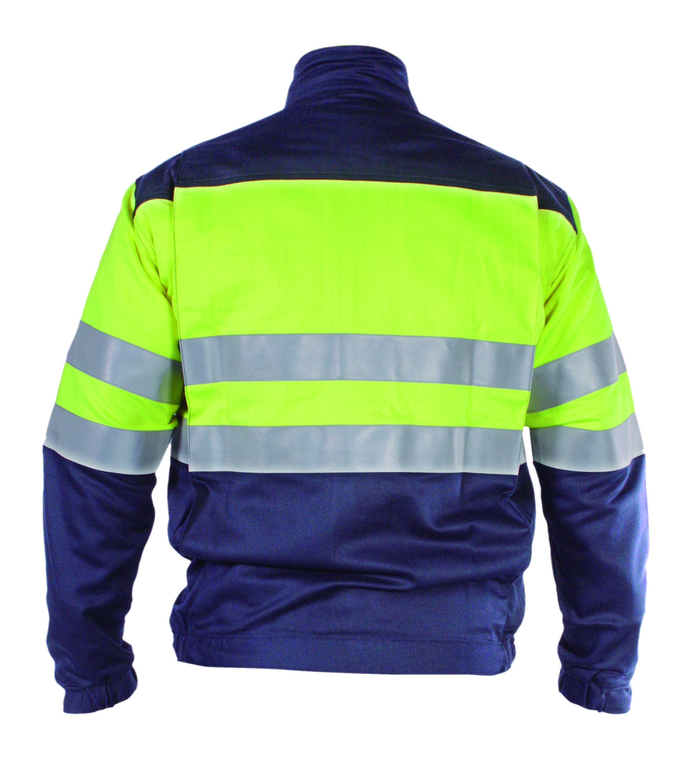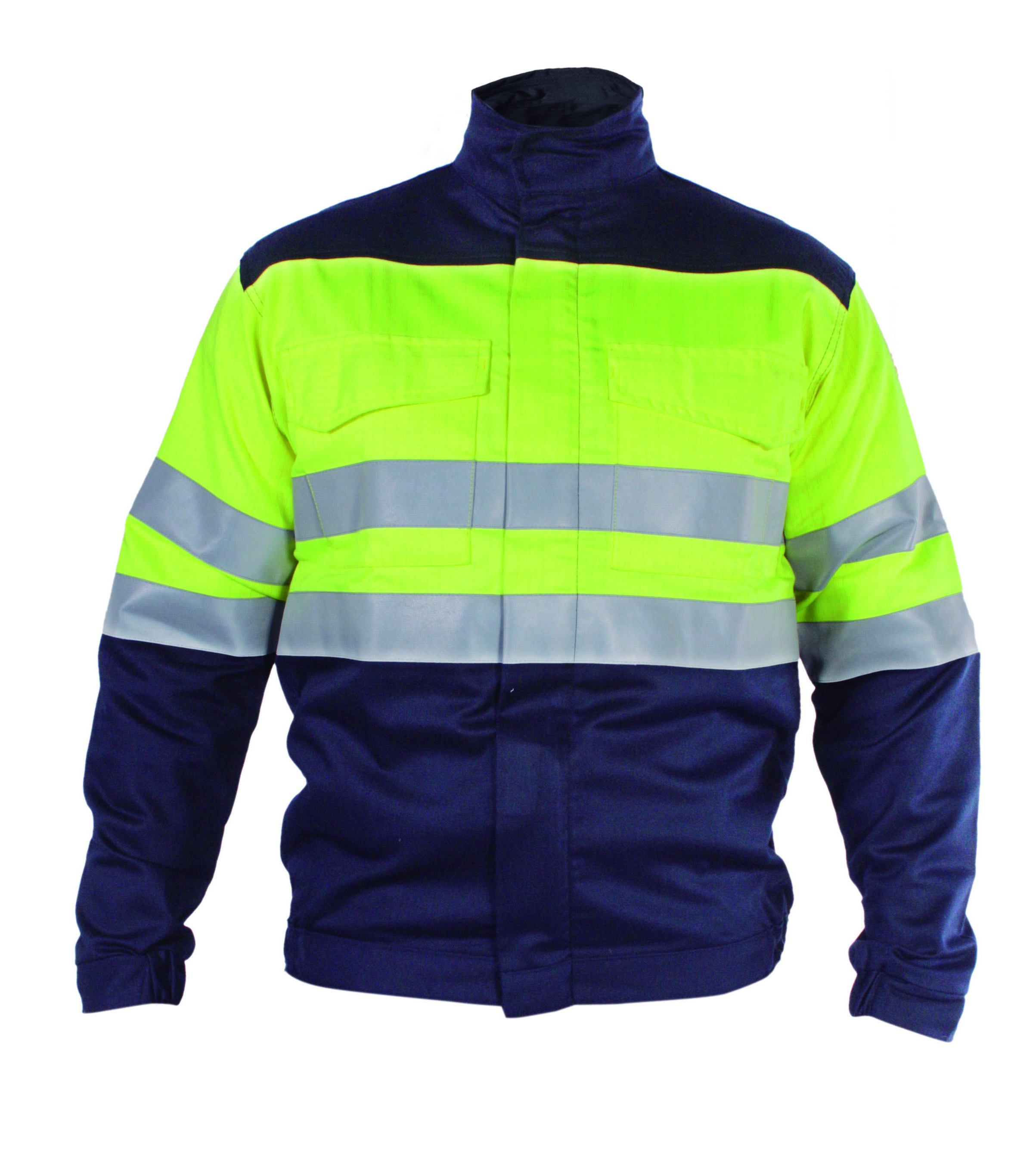 Chaqueta de gran confort y diseño para soldadura o afines fabricado en 49% Modacrílico, 42% Algodón, 5% para-aramida, 3% poliamida y 1% fibra antiestática para uso en condiciones de visibilidad insuficiente y/o con riesgo para el usuario. Cremallera ignífuga con sistema antipánico. Dos bolsillo con tapeta apresillada y cierre por velcro. Puños y elástico en cintura posterior. Cuello alto para mayor protección de radiaciones por soldadura. Doble banda reflectante perimetral. Gramaje 250 gr/m2. Color: amarillo y azul marino.