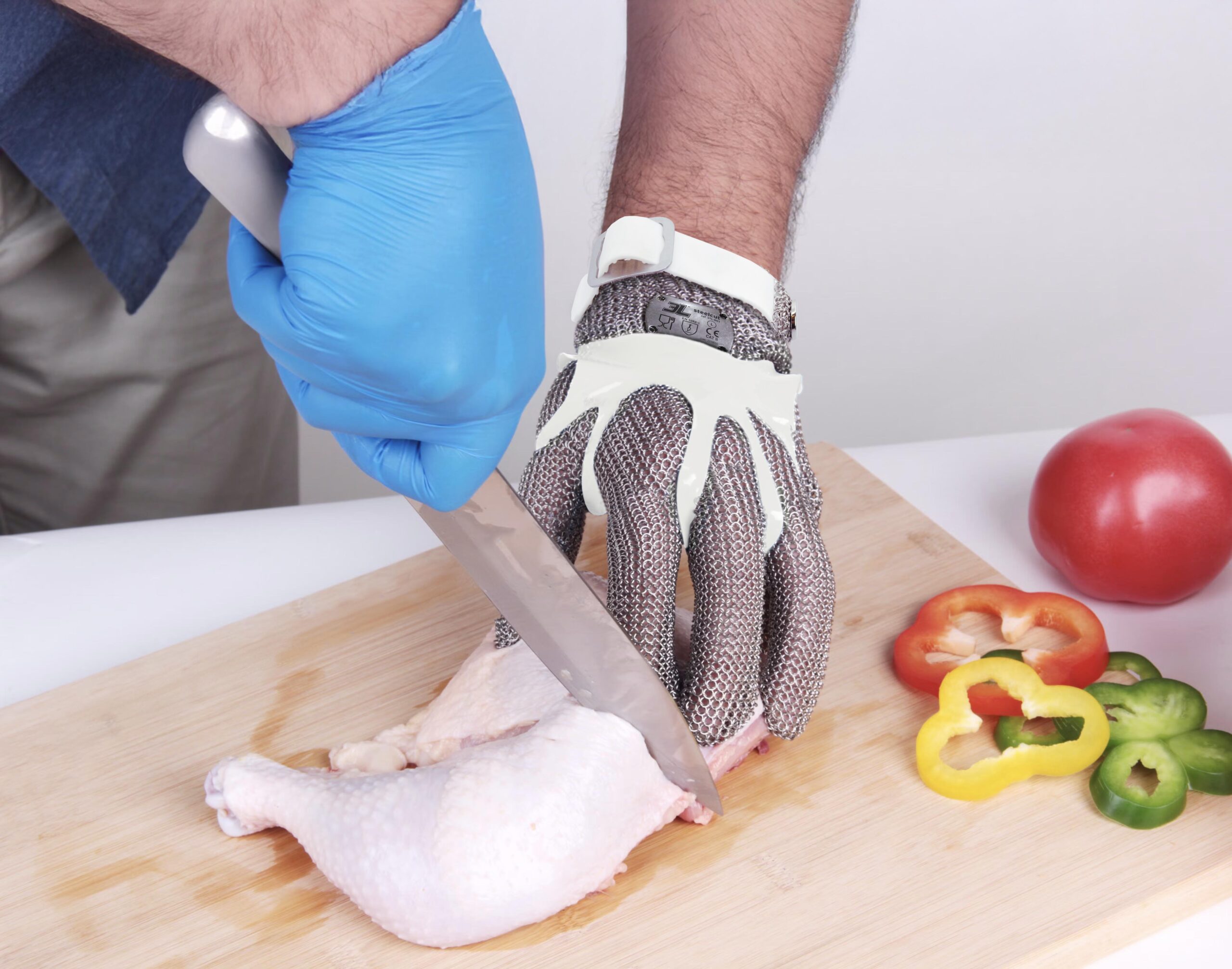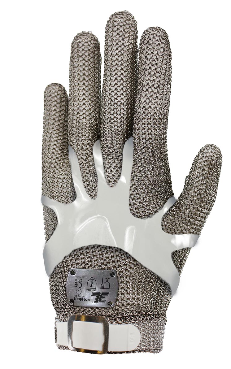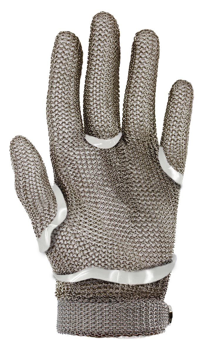 Guante ambidiestro de cinco dedos fabricado en malla metálica de acero inoxidable de 0.53 mm de grosor.
