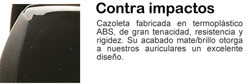 Para nuestros auriculares de la familia de “HIGH TECH EARMUFFS” hemos empleado los materiales de más alta calidad, como termoplástico ABS, material de gran tenacidad, dureza y rigidez; POM (Polioximetileno), termoplástico de alta rigidez, baja fricción y excelente estabilidad dimensional y combinaciones de poliéter y PVC para acolchados y aislamientos. Máxima calidad para la mejor protección de sus oídos.